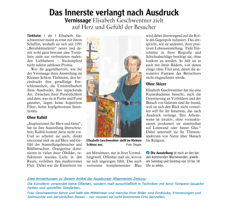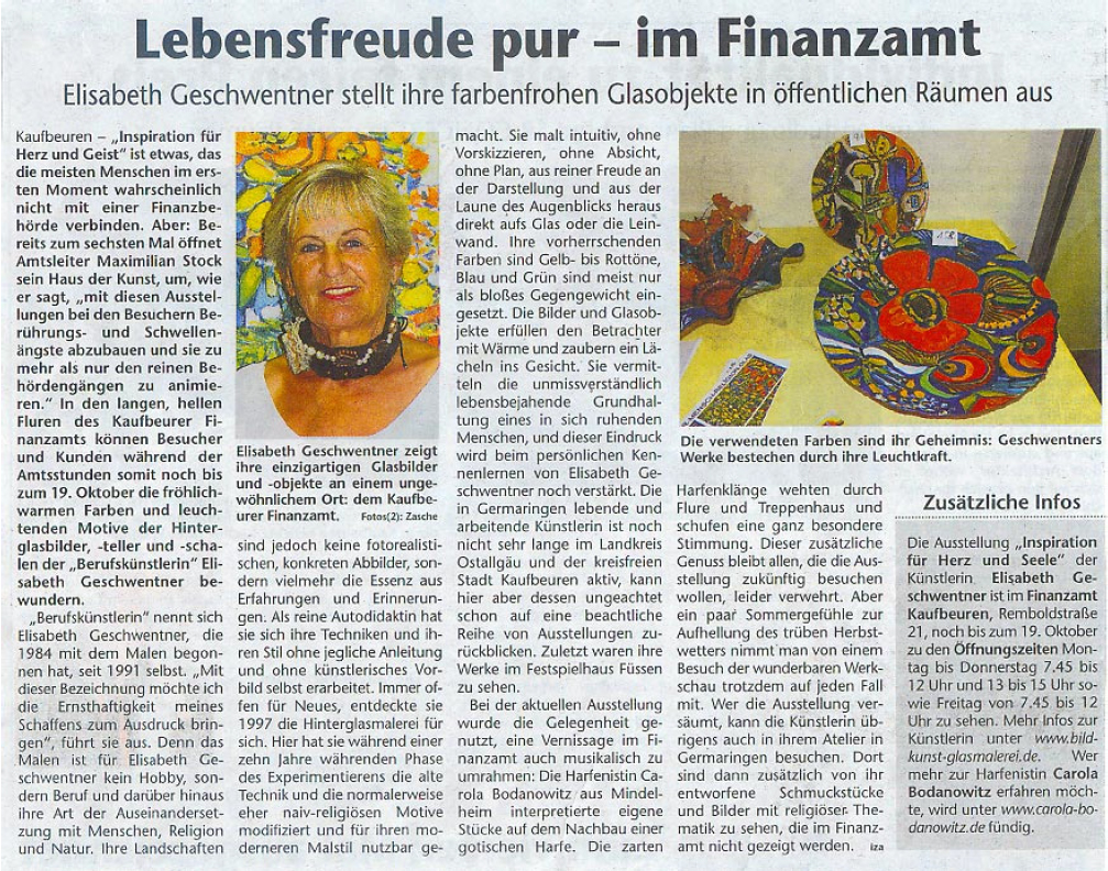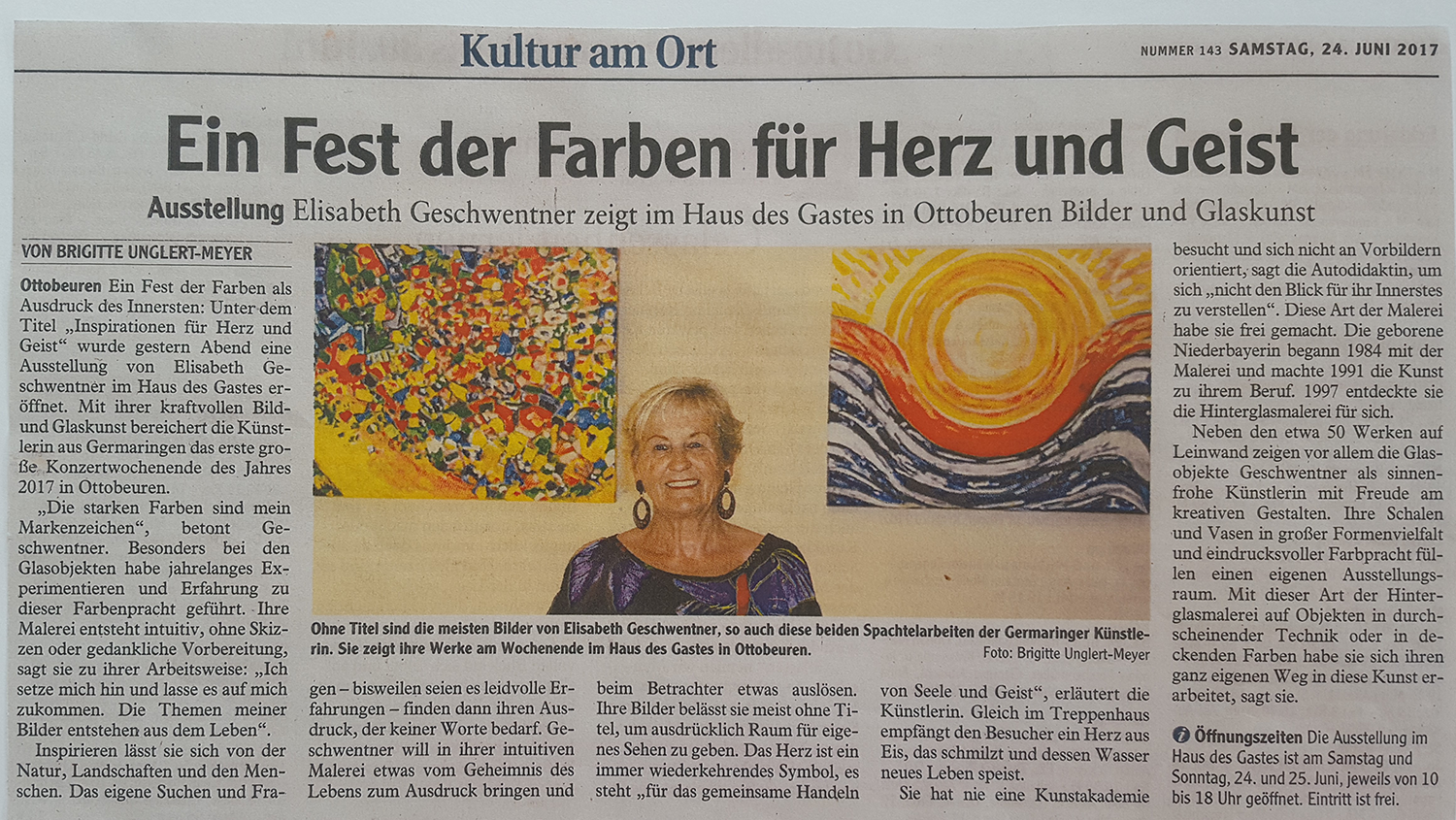 Auch die lokalen Pressevertreter besuchen mit großem Interesse die farbenprächtigen Ausstellungen der Künstlerin, die sich an dieser Stelle für die Anerkennung und den großen Zuspruch in der Berichterstattung bedankt.